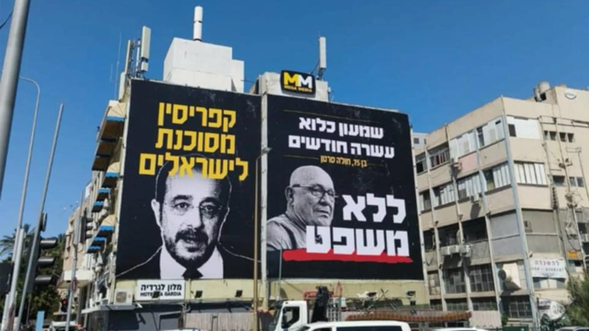 «Η Κύπρος είναι επικίνδυνη για τους Ισραηλινούς» γράφει η αφίσα στα εβραϊκά, χαρακτηρίζοντας τον σφετεριστή επιχειρηματία «φυλακισμένο, 75χρονο με καρκίνο, χωρίς δίκη»…
