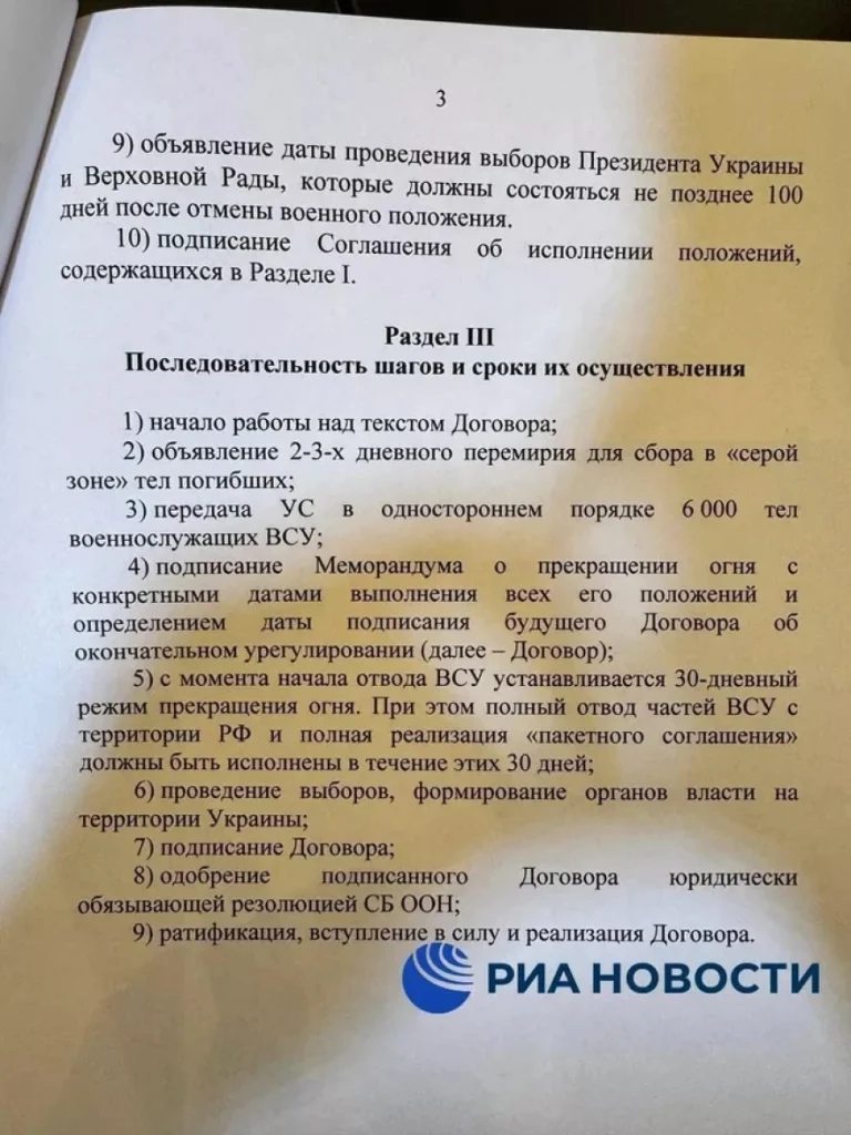Η Ρωσία δημοσιοποίησε το πλήρες κείμενο του υπομνήματος που κατέθεσε στην Ουκρανία χθες το μεσημέρι, στη διάρκεια των διαπραγματεύσεων των αντιπροσωπειών των δύο χωρών στην Κωνσταντινούπολη στο οποίο αναφέρει με βάση ποιους όρους θα αποδεχτεί την κατάπαυση του πυρός.